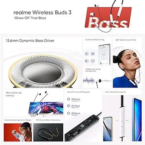 realme Buds Wireless 3 in-Ear Bluetooth Headphones,30dB ANC, Spatial Audio,13.6mm Dynamic Bass Driver,Upto 40 Hours Playback, Fast Charging, 45ms Low Latency for Gaming,Dual Device Connection (Black)